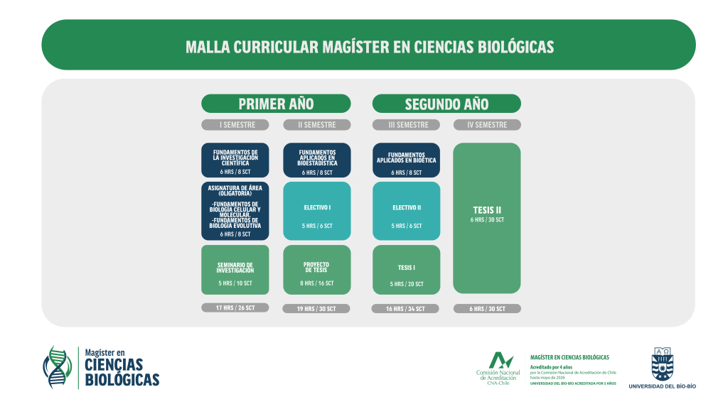 Con una duración de dos años, el estudiante está en condiciones de recibir el Grado de Magister en Ciencias Biológicas.